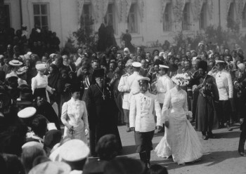 Августейшие богомольцы в сопровождении архимандрита Серафима (Чичагова) перед Царским дворцом во время торжеств прославления преподобного Серафима Саровского. Саров, 1903 г.