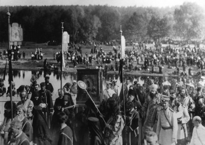Крестный ход с иконой Божией Матери «Умиление» из Дивеевского монастыря в Саровскую пустынь. Среди священнослужителей – архимандрит Серафим. 1903 г.