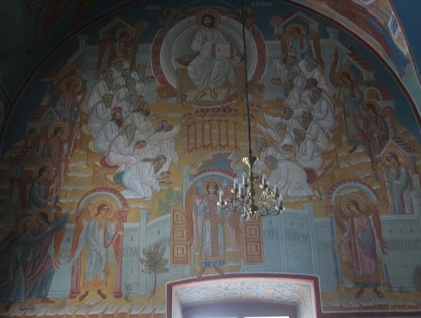 Первая большая стена расписана чудными картинами - это книга Деяний святых Апостолов. За ней идут семь стен - семь соборных посланий; потом четырнадцать стен - 14 посланий святого апостола Павла, и наконец, крайняя стена - это Откровение святого Иоанна Богослова (Апокалипсис).