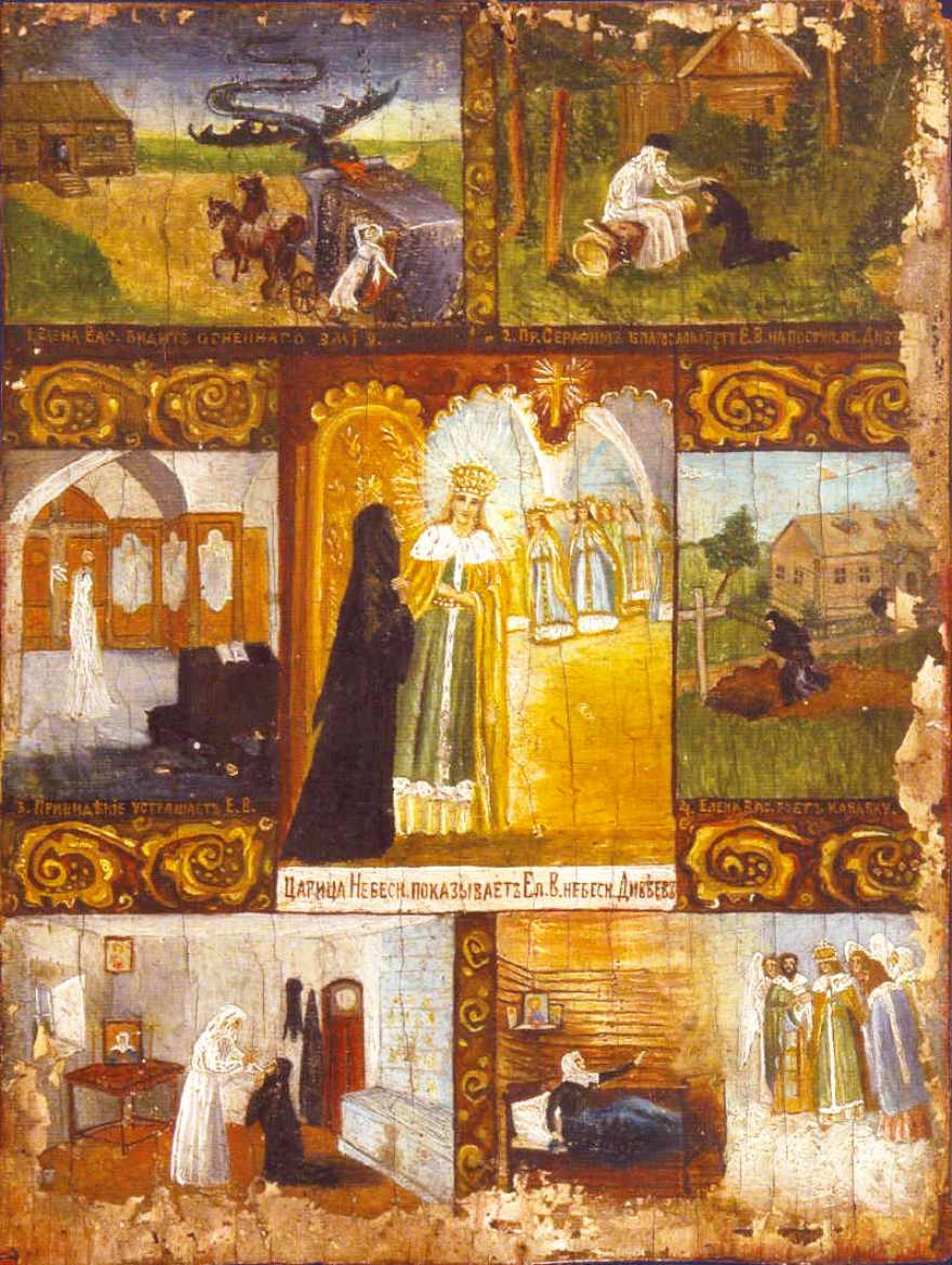 Добродетельми кротости, смирения и воздержания просиявшая, таинственная начальнице Мельничныя Общины в Дивееве явилая еси преподобная мати наша Елено, даже до смерти в совершением послушании Старцу Серафиму пребыла еси и Господа лицезрети сподобилася еси, испроси и нам дерзновение Ему Единому служити во спасение душ наших.