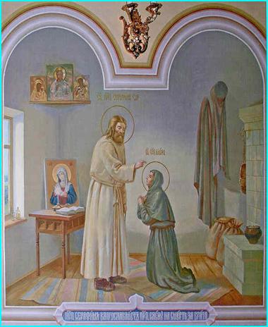 Через месяц после приезда Елены Васильевны в Дивеево ее потребовал к себе батюшка Серафим и сказал: «Теперь, радость моя, пора уже тебе и с женихом обручиться!» Елена Васильевна, испуганная, зарыдала и воскликнула: «Не хочу я замуж, батюшка!» Но отец Серафим успокоил ее, говоря: «Ты все еще не понимаешь меня, матушка! Ты только скажи начальнице-то Ксении Михайловне, что я приказал с Женихом тебе обручиться, в черненькую одежку одеться... Ведь вот как замуж-то выйти, матушка! Ведь вот какой Жених-то, радость моя!» И добавил: «Виден мне весь путь твой боголюбивый! Тут тебе и назначено жить, лучше этого места нигде нет для спасения; тут матушка Агафья Семеновна в мощах почивает; ты ходи к ней каждый вечер, она тут каждый день ходила и ты подражай ей так же, потому что тебе этим же путем надо идти, а если не будешь идти им, то и не можешь спастись. Ежели быть львом, радость моя, то трудно и мудрено, я на себя возьму; но будь голубем и все между собою будьте как голубки. Вот и поживи-ка ты тут три-то года голубем; я тебе помогу, вот тебе на то и мое наставление: за послушание читай всегда акафист, Псалтирь, псалмы и правила с утреней отправляй. Сиди да пряди, а пусть другая сестра тебе все приготовляет, треплет лен, мыкает мочки, а ты только пряди и будешь учиться ткать, пусть сестра сидит возле тебя да указывает. Всегда будь в молчании, ни с кем не говори, отвечая только на самые наинужнейшие вопросы и то «аки с трудом», а станут много спрашивать, отвечай: «Я не знаю!» Если случайно услышишь, что кто не полезное между собой говорит, скорее уходи, «дабы не внити во искушение». Никогда не будь в праздности, оберегай себя, чтобы не пришла какая мысль, всегда будь в занятии. Чтобы не впадать в сон, употребляй мало пищи. В среду и пяток вкушай только раз. От пробуждения до обеда читай: «Господи Иисусе Христе Сыне Божий, помилуй меня грешную!», а от обеда до сна: «Пресвятая Богородица, спаси нас!» Вечером выйди на двор и молись 100 раз Иисусу, 100 раз Владычице и никому не сказывай, а так молись, чтобы никто того не видал, даже бы и не подумал, и будешь ты аки Ангел! И пока Жених твой в отсутствии, ты не унывай, а крепись лишь и больше мужайся; так молитвой, вечно-неразлучной молитвой и приготовляй все. Он и придет ночью тихонько и принесет тебе кольцо, перстенек, как Екатерине-то великомученице матушке. Так вот три года и приготовляйся, радость моя, чтобы в три года все у тебя готово бы было. О, какая неизреченная радость-то тогда будет, матушка! Это я о пострижении тебе говорю, матушка; чрез три года постригайся, приуготовив себя, ранее не нужно, а как пострижешься-то, то будет у тебя в груди благодать воздыматься все более и более, а каково будет тогда! Когда Архангел Гавриил, представ пред Божией Матерью, благовестил ей, то Она немного смутилась и тут же сказала: «Се раба Господня! Буди мне по глаголу твоему!» Тогда вот и ты скажи также: «Буди мне по глаголу твоему!» Вот о каком браке и Женихе я тебе толкую, матушка; ты слушай меня и никому до времени того не говори, но верь, что все мною реченное тебе сбудется, радость моя!«