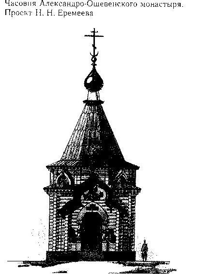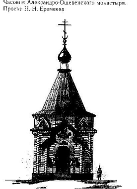Первый деревянный Никольский храм был возведен еще самим преподобным Александром. После кончины в 1479 г. преподобного Александра обитель начала приходить в упадок. Монастырь опустел, в нём осталось только 5 пожилых монахов. Положение стало меняться к лучшему с 1488 года, когда в игумены монастыря был возведен сын местного священника Максим, управлявший обителью до 1531 года. При нём возросло число братии, увеличились монастырские земельные владения, была построена ещё одна церковь — в честь Успения Богородицы. При митрополите Филиппе в 1578 г. была составлена служба преподобному Александру Ошевенскому, а Царём Иоанном Грозным отведены в пользу обители земли вокруг нее на пять верст. В 1540 г. обе церкви сгорели по неизвестной причине, однако вскоре были восстановлены. На этот раз обе церкви простояли до 6 мая 1706 г., когда монастырь целиком сгорел от молнии. После пожара 1706 г. в Александро–Ошевенском монастыре стали возводиться каменные постройки часть из которых сохранилась до наших дней. Облик монастыря до пожара 1706 г. помогают восстановить иконы. В 17 в. иконы с изображением Ошевенского монастыря получили широкое распространение. Они разносили по всей Руси славу о святом и его обители. Именно тогда в Московском Успенском соборе был установлен особый праздник в честь преп. Александра Ошевенского (20 апреля/3 мая — память прп. Александра, Ошевенского Чудотворца). А в 1667 году было установлено проведение крестного хода из Каргополя в Ошевенский монастырь, как заповедали прп.Александр и свт. Иоанн Златоуст, явившись одному крестьянину.