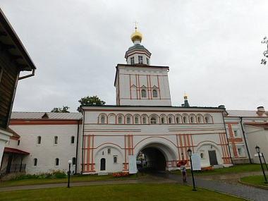 Надвратная церковь свт. Филиппа расположена в западном прясле монастырской стены ансамбля Валдайского Иверского монастыря.