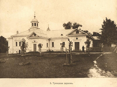 До 1889 года находился на месте ныне существующего Казанского собора. Во время закладки фундамента этого собора, по благословению преподобного Амвросия, старый храм перенесли на монастырское кладбище, и 5 июля 1890 года освятили во имя Пресвятой Троицы. В нем был одноярусный деревянный иконостас, отделанный белым с позолотой.
