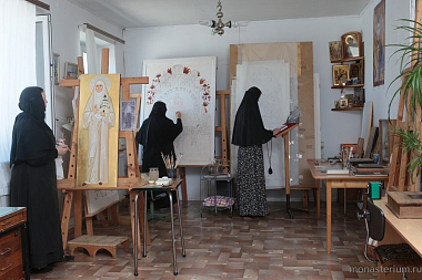 Большая часть внутреннего убранства в настоящее время, как и прежде, выполнена в мастерских обители. Для благолепного украшения Божия храма сестры пишут иконы для иконостаса и в киоты, вышивают бисером оклады, изготавливают витражи, в чеканной мастерской делают басменные киоты, в золотошвейной - вышивают плащаницы и хоругви.