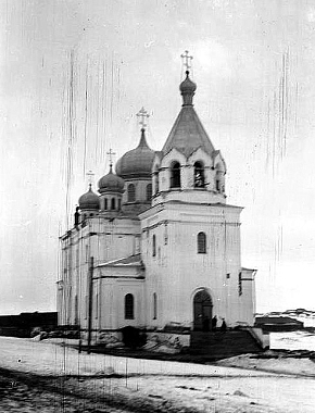 Как бы образом другого мира были стоявшие рядом с храмом трехэтажное с длинным балконом здание управления лагерей, выполненное в стиле советского конструктивизма, и гостиница НКВД «Прибой». Чекистских кабинетов в здании было не так много, всего пять, зато большую часть здания занимал огромный зал ресторана.<br>