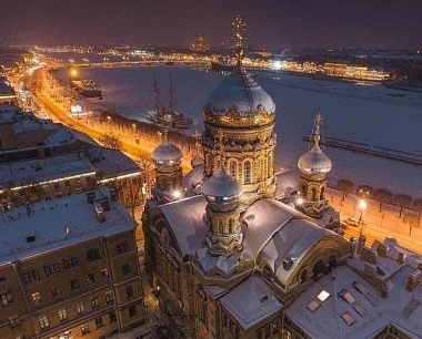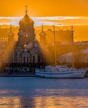 С Благовещенского моста, что ведёт на Васильевский остров из центра Петербурга, хорошо виден православный храм Успения Пресвятой Богородицы.