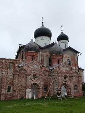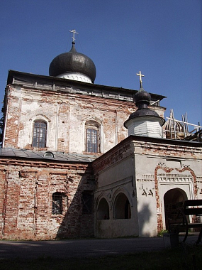 Не менее показателен для 50-60 гг. XVI в. и Троицкий собор. Его четырехстолпный с тремя апсидами основной объем был завершен время главами, являя тем самым краткую редакцию того типа храма, который был представлен еще в начале века Спасо-Преображенским собором Хутынского монастыря. Многоглавие, исчезнувшее из практики новгородского храмового строительства в XII в., возобновляется в XVI в., но уже на общерусской типологической и стилистической основе. В архитектуре Троицкого собора черты традиционного новгородского стиля практически отсутствуют.