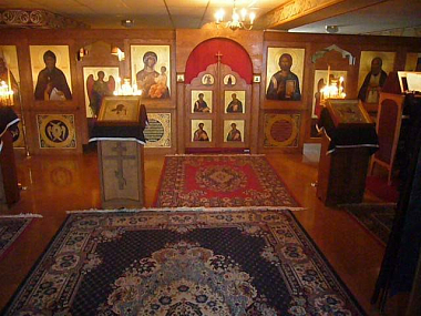 Белые внутренние стены храма-часовни были расписаны целой группой иконописцев. Начал эти работы ректор Свято-Троицкой семинарии архимандрит Лука (Мурьянка), но он ограничился росписью арочного пространства, разделяющего среднюю и главную часть храма, воспроизведя фреску афонского монастыря Ставроникита. Затем отдельные фрагменты росписи выполнили священник Иаков Ференс и насельник Свято-Троицкого монастыря иеромонах Андрей (Эрастов). В 1997 роспись завершил в качестве выпускной дипломной работы пятикурсник Свято-Троицкой семинарии Петр Дзюба, работавший к тому времени два года в иконописной мастерской монастыря и участвовавший в росписи храма св. кн. Александра Невского в г. Лейквуде, шт. Нью-Джерси. Первая со входа композиция была посвящена теме Второго Славного Пришествия Господа нашего Иисуса Христа, в средней части храма разместились житийные композиции. При выходе из средней части храма-часовни, над дверным проемом, П. Дзюба выполнил фреску «Сошествие в ад» воскресшего Христа.