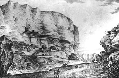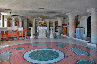 Вырублена в скале на краю отвесного обрыва. В плане неправильный прямоугольник. Внешняя стена над обрывом сложена из камня с оконными проемами. Потолок плоский. Внутренняя продольная стена расчленена четырьмя грубо вытесанными колоннами. Масляной живописью XIX в. покрыты скала над наружной стеной и стена между двумя колоннами в интерьере. К памятнику ведет широкая каменная лестница.
