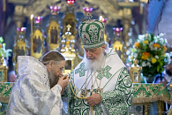 Царю́ Преве́чный, сия́яй со́лнце Свое́ на благи́я и злы́я, пра́ведныя любя́й, гре́шныя же ми́луяй, скве́рну душе́вную и теле́сную на́шу омы́й, оби́тель Свою́ в нас, а́ще и недосто́йных рабе́х Твои́х, сотвори́ти благоволи́, потреби́ нечи́стая на́ша помышле́ния, изгла́ди неподо́бная дея́ния, напра́ви язы́к глаго́лати благоуго́дная пред Тобо́ю, да чи́стым се́рдцем и устны́ со умиле́нием зове́м: Свят, Свят, Свят еси́ Го́споди Бо́же наш, о Не́мже апо́стольский лик я́ве глаго́лет, к Нему́ же проро́ческий собо́р вы́ну взира́ет! Свят еси́ Го́споди Бо́же наш, Его́ же полк му́ченический боголе́пно испове́дует, и преподо́бных во́инство Пресвято́е и́мя славосло́вит! Свят еси́ Го́споди Бо́же наш, о Нем же пусты́нников мно́жество при́сно воздыха́ет, от Него́ же по́стников по́двиги венча́ются! Свят еси́ Го́споди Бо́же наш, Ему́ же святи́тели и па́стыри благода́рственное прино́сят пе́ние, И́мже вселе́нстии учи́тели во спасе́ние на́ше богому́дрствуют! Свят еси́ Го́споди Бо́же наш, приими́ мольбу́ о нас и предста́тельство всех святы́х, па́че же простира́ющую к Тебе́ о нас ру́це Своя́, Де́ву Пречи́стую! Свят еси́ Го́споди Бо́же наш, огради́ нас святы́ми Твои́ми А́нгелы, и отжени́ от нас духо́в зло́бы поднебе́сных! Свят, Свят, Свят еси́ Го́споди Бо́же наш, поми́луй ны, па́дшее созда́ние Твое́, И́мене ра́ди Свята́го Твоего́!