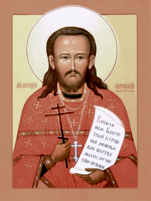 Священномученик иерей Аркадий Николаевич Гаряев родился в 1877 году в мадьярской (венгерской) семье. С 1910 года он служил в Никольской церкви села Боровское Пермской губернии, преподавал в земской школе. Также он был назначен священником в походную Казанского-Богородицкую церковь, чтобы вести миссионерскую деятельность среди местного населения – вогулов. 1 июля 1918 года отец Аркадий Гаряев совершал венчание в своем храме. В это время прямо в церковь ворвалась банда безбожников-красноармейцев из мадьяр. Они вывели священника из храма прямо в богослужебном облачении, повели в лес к скотомогильнику и там убили, а тело сбросили в овраг. Через 11 дней тело священномученика было найдено, его перенесли в Никольскую церковь, где он служил, отпели и похоронили в церковной ограде.