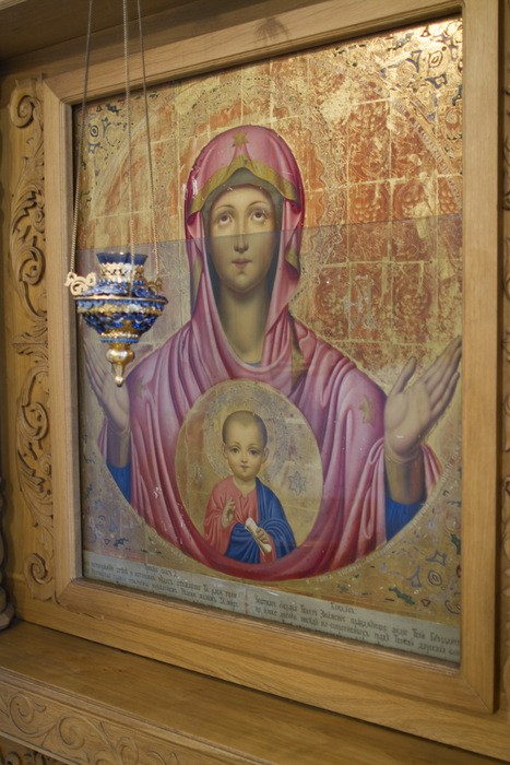 Икона Матери Божией «Знамение» хранится в напольном киоте в главном храме монастыря. На иконе изображена Дева Мария с воздетыми к Небу руками с Младенцем Спасителем в центре. Внизу иконы располагаются тексты тропаря и кондака в честь сего образа. Написана она в к. 19 – н 20 вв. сестрами Серафимо-Понетаевского женского монастыря, основанного в память о прп. Серафиме Саровском. Эта икона является одной из точных копий чудотворного образа Пресвятой Богородицы «Знамение Серафимо-Понетаевская» 1879г., которая прославилась 14 мая 1885 г. чудесным сиянием изображенного на ней лика Божией Матери и движением Её глаз, а также исцелением больных по молитве перед этим образом и весьма многими другими чудесами. Праздник в честь этого списка иконы «Знамение», как и многих других списков, установлен 27 ноября/10 декабря в память спасения древнего Новгорода заступничеством Пресвятой Богородицы, произошедшего в 1170г.