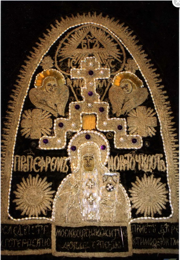 Древний, вышитый жемчугом покров с главы (мощей) преп.Ефрема Новоторжского чудотворца.