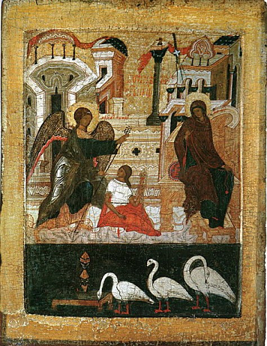 На древ­не­рус­ских ико­нах, та­ких, как, на­при­мер, мо­за­ич­ное изо­бра­же­ние в ки­ев­ском Со­фий­ском со­бо­ре на двух стол­бах, под­дер­жи­ва­ю­щих ал­тар­ную ар­ку, или в нов­го­род­ской Бо­ри­со­глеб­ской церк­ви Ан­то­ни­е­ва мо­на­сты­ря Бла­го­ве­ще­ние изо­бра­же­но в дру­гом ви­де: Пре­свя­тая Де­ва дер­жит в ру­ках ве­ре­те­но, или по­ча­ток, и пря­дет. В мос­ков­ском Успен­ском со­бо­ре или в нов­го­род­ской Ми­ро­но­сиц­кой церк­ви – не Са­ма Бо­го­ма­терь пря­дет, а де­вы, си­дя­щие при Ее но­гах, или де­ва, си­дя­щая за Ней.