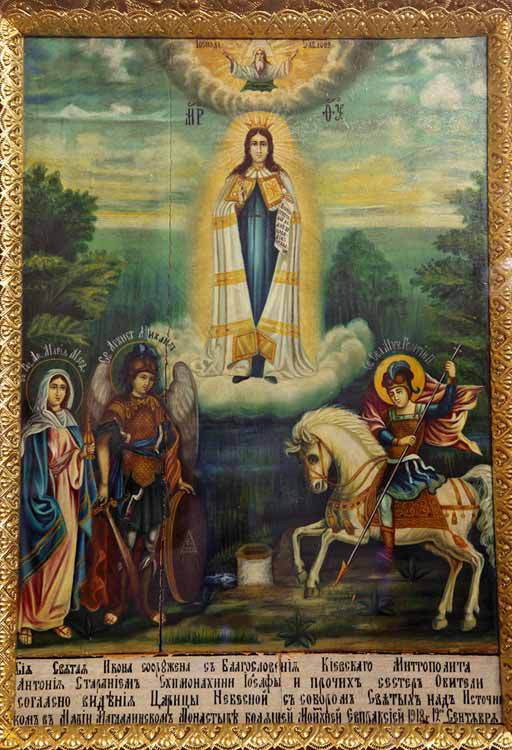 2 сентября 1918 года, над речным источником обители явилась Божия Матерь с собором святых - Архистратигом Божиим Михаилом, великомучеником Георгием Победоносцем, Святой Марией Магдалиной. Стоящая на облаке Царица Небесная - в царской короне, мантии с Архиерейскими скрижалями, держала в Своих руках хартию, накоторой отчетливо начертывались слова: «Никтоже, притекаяй ко Мне, посрамлен отходит». Это видение дано было болящей схимонахине Евпраксии, и по благословению Киевского митрополита Антония запечатлено на иконе монахиней Иоасафой.