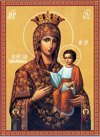 Богоматери воспоим божественне,/ припадающе Божественному образу Ея,/ преславно бо на том самонаписася,/ и источает чудес струй с верою притекающим,/ и избавляет от зол зовущих Ей:/ радуйся, Невесто Неневестная.