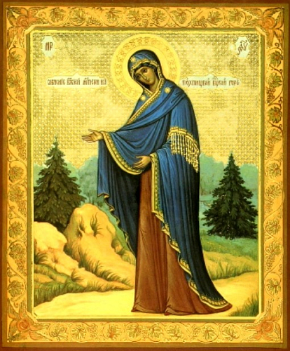 Светоподательную свещу сущим во тьме греха и юдоли плача явившуюся, зрим Святую Деву, над горою Богородицкою стоящую и руци Своя долу простирающую, желая возвести всех труждающихся и обремененных из мрака богоотступническаго живота сего к свету богопознания. Уповая на Твое всемощное предстательство у Престола Сына Твоего, Христа Бога нашего, и на Твое нелицеприятное попечение о душе христианстей, ко Господу стремящейся, вопием Ти сице: Радуйся, ищущих спасения и уединеннаго сопребывания с Господом зрящая; радуйся, глад духовный алчущих и жаждущих правды щедро утоляющая. Радуйся, родителей, оскорбляемых чадами, отступившими от Господа, единственное утешение; радуйся, чад, гонимых родителями, Бога забывших, необоримое укрепление. Радуйся, плачущих по усопшим христианское упование; радуйся, чающих жизни вечныя со Христом, непостыдное в ней уверение. Радуйся, Любвеобильная, слезы сердец наших милостивно осушающая.