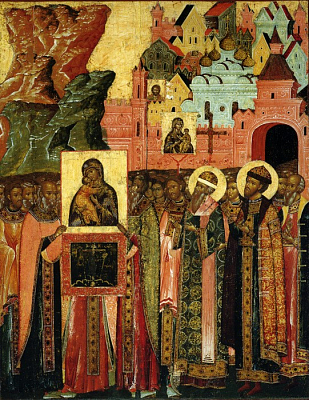 Хотя великий князь Василий защищение стяжати стольному граду своему, повеле Владимирскую икону Твою в Москву пренести. И во сретение ея усердно изшедше князь и святитель московский Киприан со освященным собором и всем множеством людей, до земли пред нею поклонишася, якоже бо Самую Тя, Пречистая, к ним приходящую, сретаху, зовуще Тебе: «О Мати Божия, спаси землю Русскую», вкупе же и поюще Богу: Аллилуиа.