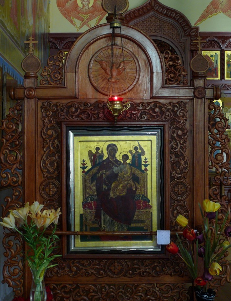 На иконе изо­бра­же­на Пре­чи­стая Де­ва в баг­ря­ном оде­я­нии, вос­се­да­ю­щая на цар­ском троне. На ру­ках Ее – Бо­гом­ла­де­нец со свит­ком в ле­вой ру­ке и бла­го­слов­ля­ю­щий дес­ни­цей. Пра­вой ру­кой Бо­го­ро­ди­ца ука­зы­ва­ет на Сво­е­го Цар­ствен­но­го Сы­на, как на Спа­си­те­ля всех че­ло­ве­ков. На зад­нем плане – два ан­ге­ла, ко­то­рые с бла­го­го­ве­ни­ем осе­ня­ют кры­ла­ми Пре­чи­стую Де­ву.
