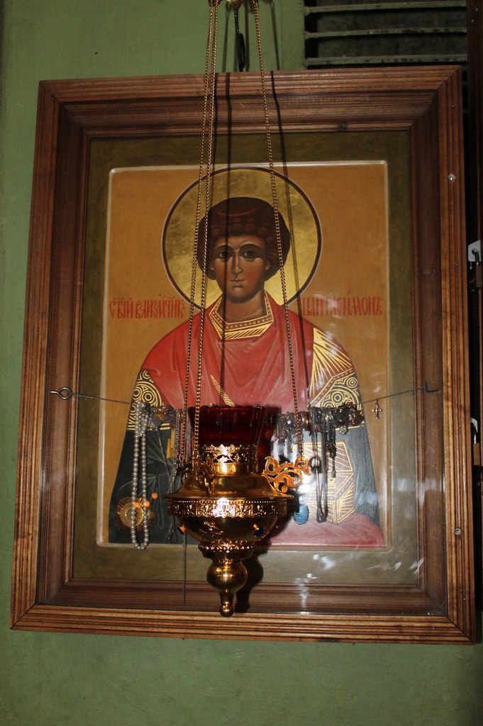Икона великомученика и целителя Пантелеимона с частицей мощей.