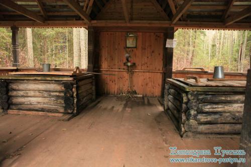 На кресте на западной стороне был изображен распятый Иисус Христос, на восточной – Преподобный Никандр; над его главою – Благовещение Пресвятой Богородицы. В этой часовне совершалось водосвятие в праздник святых первоверховных апостолов Петра и Павла 29 июня (12 июля), который праздновался в обители ещё и как день обретения в 1687 году нетленных мощей преподобного Никандра.