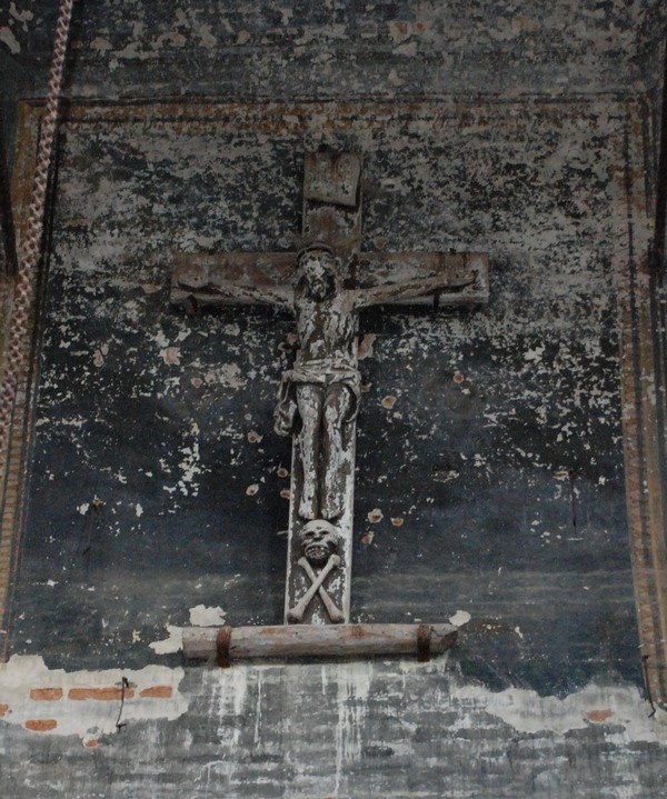 Деревянное Распятие под куполом Никольского храма – фрагмент иконостаса 17 века, уничтоженного в советское время. Вокруг Креста следы от выстрелов из табельного оружия. В Распятого Спасителя метились, как в мишень в тире.