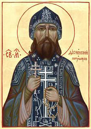 Преподобномученик Дионисий родился 26 сентября 1866 года в деревне Сумино Савцинской волости Кашинского уезда Тверской губернии в семье крестьян Иосифа Иоакимовича и Матроны Ивановны Петушковых. 24 сентября 1905 года Дионисий Иосифович поступил послушником в Нило-Столобенскую пустынь в Осташковском уезде Тверской губернии и исполнял здесь послушание свечника. 10 января 1910 года он был пострижен в монашество с именем Евфимий. Впоследствии он был пострижен в схиму с именем Дионисий и подвизался в обители до ее закрытия безбожниками в 1927 году.На следующий день после закрытия пустыни, сюда приехал благочестивый богатый крестьянин Сергей Федорович Комаров; он был давним благотворителем Нило-Столобенской обители. В 1910 году он к своей земле прикупил землю вышневолоцкого купца, построил на этой земле хутор и успешно занимался хлебопашеством, применяя передовые технологии и машины; он регулярно жертвовал в монастырь сельскохозяйственные продукты, выращенные на своей земле. В 1920-х годах прихожане избрали его председателем церковной двадцатки.Видя бедственное положение братии при советской власти, он давно мечтал пригласить жить на хутор кого-нибудь из монахов и, когда оказался в закрытом монастыре, то тут же и пригласил переехать к себе отца Дионисия, которого знал в течение многих лет и почитал как благодатного старца. Сергей Федорович выделил ему на своем хуторе Черенчиха пустовавшую избу из двух комнат. В одной комнате старец ночевал, а другая была отведена под моленную, где он поставил сделанный для себя гроб.Местному населению скоро стало известно, что на хуторе поселился схимонах из Нило-Столобенской обители, и люди потянулись к нему – кто за благословением на то или иное дело, кто испросить совета, как поступить в трудном случае чаще всего семейной жизни, кто приходил спросить, стоит ли вступать в колхоз, а иные просили помолиться об исцелении от какого-нибудь недуга. Отец Дионисий всех принимал и, помолившись, больных помазывал маслом из лампады. Со временем к старцу стало стекаться все больше людей, и все это стало известно властям.В начале 1930 года в доме, где жил схимник, при участии сельских властей и колхозников был произведен обыск; обыскивавшие забрали для своих нужд некоторые вещи, необходимые в хозяйстве, но не тронули старца; вскоре после обыска отец Дионисий покинул дом и так поначалу избежал ареста. Схимника приютили верующие люди на другом хуторе, и, поскольку таких людей было немало, отец Дионисий мог перемещаться с одного хутора на другой.В полночь 6 февраля 1931 года на хутор Черенчиха прибыли сотрудники ОГПУ с намерением арестовать старца. Не обнаружив его здесь, они приступили к хозяйке, чтобы она немедленно сообщила, где находится схимник. В это время вернулся муж хозяйки, Сергей Федорович, от которого они также стали требовать, чтобы он выдал местонахождение старца, но он на это ответил: «Не знаю, где он, и какое вам до него дело. Лучше берите вместо него меня, я хочу пострадать за старца». Увидев, что с ним бесполезно вести переговоры, один из сотрудников вновь обратился к его жене, потребовав от нее, чтобы она разыскала схимника, и в конце концов заставил ее вместе с ними отправиться на его поиски. Отец Дионисий вскоре был арестован и привезен в Черенчиху, а оттуда его отправили в тюрьму.Сотрудники ОГПУ, допросив 