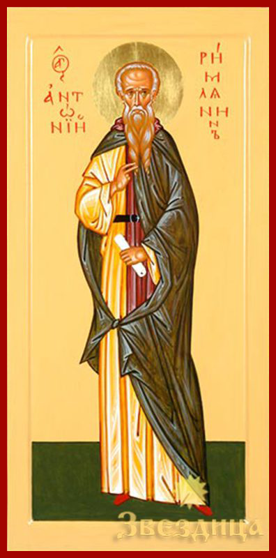 Преподобный Антоний Римлянин родился в Риме в 1067 году от богатых родителей, держащихся православного исповедания веры, и был воспитан ими в благочестии. Лишивших родителей в 17 лет, он принялся за изучение писаний отцов на греческом языке. Затем он раздал часть наследства нищим, а другую вложил в деревянную бочку и пустил ее в море. Сам же принял пострижение в одном из пустынных скитов, где прожил 20 лет.