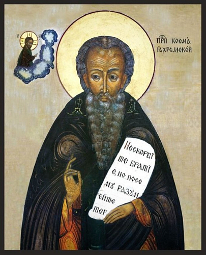 Пре­по­доб­ный Кос­ма Яхром­ский был слу­гой од­но­го бо­яри­на и во вре­мя про­дол­жи­тель­ной бо­лез­ни сво­е­го гос­по­ди­на уте­шал его чте­ни­ем книг. Как-то, пе­ре­ез­жая из го­ро­да в го­род, они оста­но­ви­лись на ре­ке Яхро­ме. Здесь пре­по­доб­но­му Кос­ме яви­лась на де­ре­ве ико­на Успе­ния Пре­свя­той Бо­го­ро­ди­цы, от ко­то­рой он слы­шал го­лос, по­веле­вав­ший быть ему ино­ком и устро­ить мо­на­стырь. Его боль­ной гос­по­дин то­гда же по­лу­чил от ико­ны ис­це­ле­ние, а пре­по­доб­ный Кос­ма от­пра­вил­ся в Ки­ев и в Пе­чер­ском мо­на­сты­ре при­нял по­стриг. По­том с яв­лен­ной ико­ной Бо­го­ма­те­ри он по вну­ше­нию свы­ше сно­ва от­пра­вил­ся на Яхро­му и в 40 вер­стах от г. Вла­ди­ми­ра при по­со­бии доб­рых хри­сти­ан по­стро­ил храм в честь Успе­ния Пре­свя­той Бо­го­ро­ди­цы. К пре­по­доб­но­му ста­ла со­би­рать­ся бра­тия, и об­ра­зо­вал­ся мо­на­стырь. Пре­по­доб­ный Кос­ма был из­бран игу­ме­ном. Сла­ва о ино­че­ских по­дви­гах свя­то­го до­хо­ди­ла в те вре­ме­на да­же до ве­ли­ко­го кня­зя. Пре­по­доб­ный Кос­ма скон­чал­ся в глу­бо­кой ста­ро­сти 18 фев­ра­ля 1492 г. и был по­гре­бен в ос­но­ван­ной им оби­те­ли. Па­мять ему так­же тво­ри­лась 14 ок­тяб­ря, в день празд­но­ва­ния Бо­жи­ей Ма­те­ри ра­ди Ее ико­ны Яхром­ской.