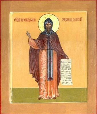 Возбранный угодниче Христов, / иже яко Авраам изшел еси от земли твоея,/ и от рода твоего и от дому отца твоего, / и пришел еси в землю, юже ти Христос показа, / сотвори о нас мольбу к Нему, да взыдя на Гору Господню, / и став на Месте Святем Его, рцем Ти: / Радуйся, Михаиле, великий подвижниче Христов.