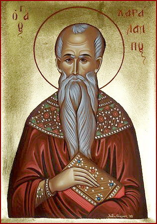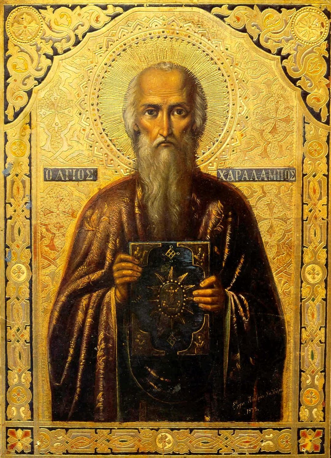 Святой Харалампий, епископ фессалийского города Магнезии (северо-восточная область Греции), успешно распространял веру во Христа Спасителя. Весть о его проповеди дошла до правителя области Лукиана и военачальника Лукия, по распоряжению которого святой был схвачен и приведен на суд, где твердо исповедал веру во Христа и отказался принести жертву идолам. Несмотря на преклонный возраст епископа (ему было уже 113 лет), его подвергли чудовищным истязаниям: терзали тело железными крючьями, пока не содрали всю кожу с головы до ног. Святой при этом обращался к мучителям: "Благодарю вас, братия, вы обновили дух мой!"