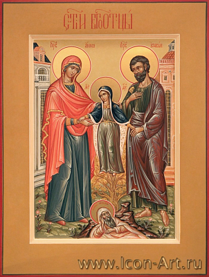 Святой праведный Иоаким, сын Варпафира, был потомком царя Давида, которому Бог обещал, что от семени его родится Cпаситель мира. Праведная Анна была дочерью Матфана и по отцу была из колена Левиина, а по матери – из колена Иудина. Супруги жили в Назарете Галилейском. Они не имели детей до глубокой старости и всю жизнь скорбели об этом. Им приходилось переносить презрение и насмешки, так как в то время бесчадие считалось позором. Но они никогда не роптали и только горячо молились Богу, смиренно уповая на Его Волю. Однажды во время большого праздника дары, которые взял праведный Иоаким в Иерусалим для принесения их Богу, не были приняты священником Рувимом, который считал, что бездетный муж недостоин приносить жертву Богу. Это очень опечалило старца, и он, считая себя самым грешным из людей, решил не возвращаться домой, а поселиться в одиночестве в пустынном месте. Его праведная супруга Анна, узнав, какому унижению подвергся ее муж, стала в посте и молитве скорбно просить Бога о даровании ей ребенка. В пустынном уединении и постничестве о том же просил Бога и праведный Иоаким. И молитва святых супругов была услышана: им обоим Ангел возвестил о том, что родится у них Дочь, которую благословит весь род человеческий. По повелению Небесного Вестника праведные Иоаким и Анна встретились в Иерусалиме, где по обетованию Божию у них и родилась Дочь, нареченная Марией.