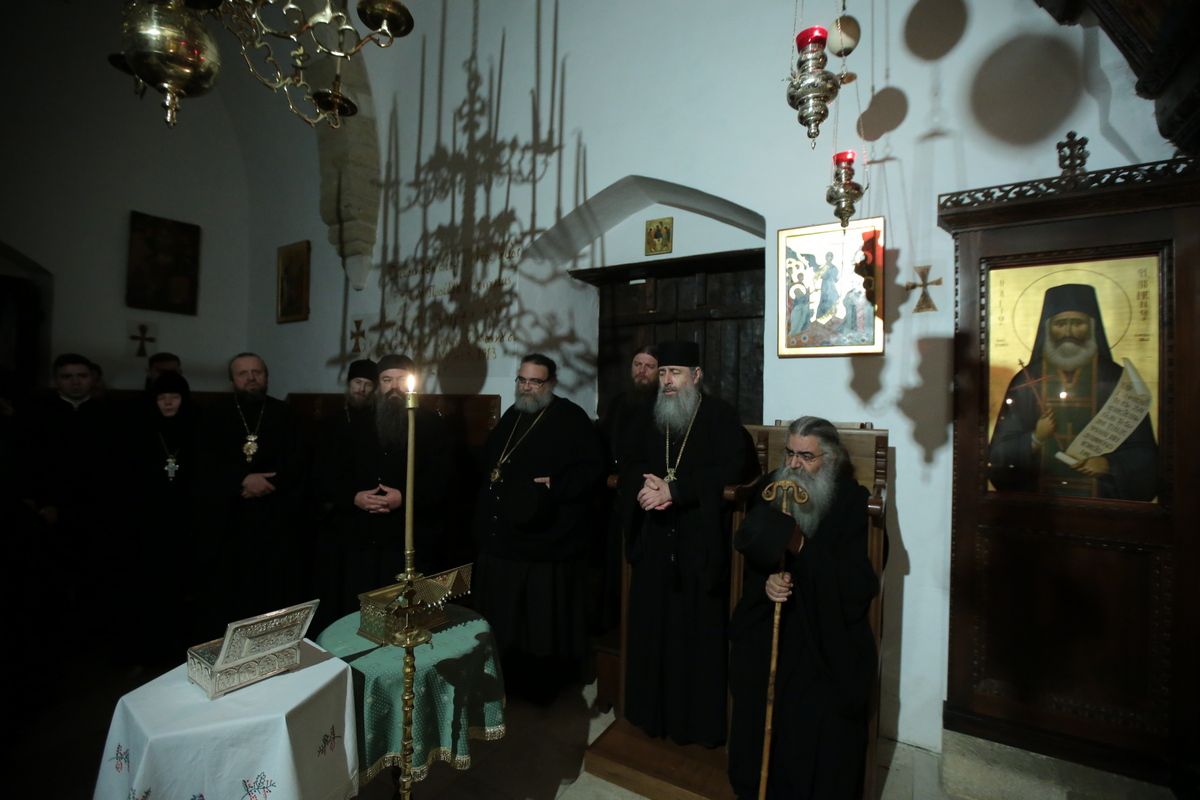 По окончании экскурсии делегация проследовала к месту захоронения первого Президента Республики Кипр архиепископа Макария III (1913–1977), который входил в число братии монастыря. У гробницы архиепископа митрополит Святогорский Арсений отслужил заупокойную литию. Молитвенные песнопения исполнил квартет студентов Московской духовной академии и семинарии, который сопровождает делегацию.