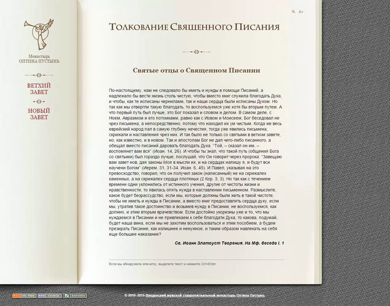 Несколько лет назад на сайте Свято-Введенского ставропигиального монастыря Оптина Пустынь началась работа над проектом «Толкование Священного Писания». На данный момент проект, который смело можно назвать уникальным, уже действует и имеет обширную, быстро увеличивающуюся аудиторию пользователей. О том, как воплощалась и развивается ныне эта идея, мы попросили рассказать ее автора, насельника монастыря, редактора оптинского сайта иеромонаха Даниила (Михалева).