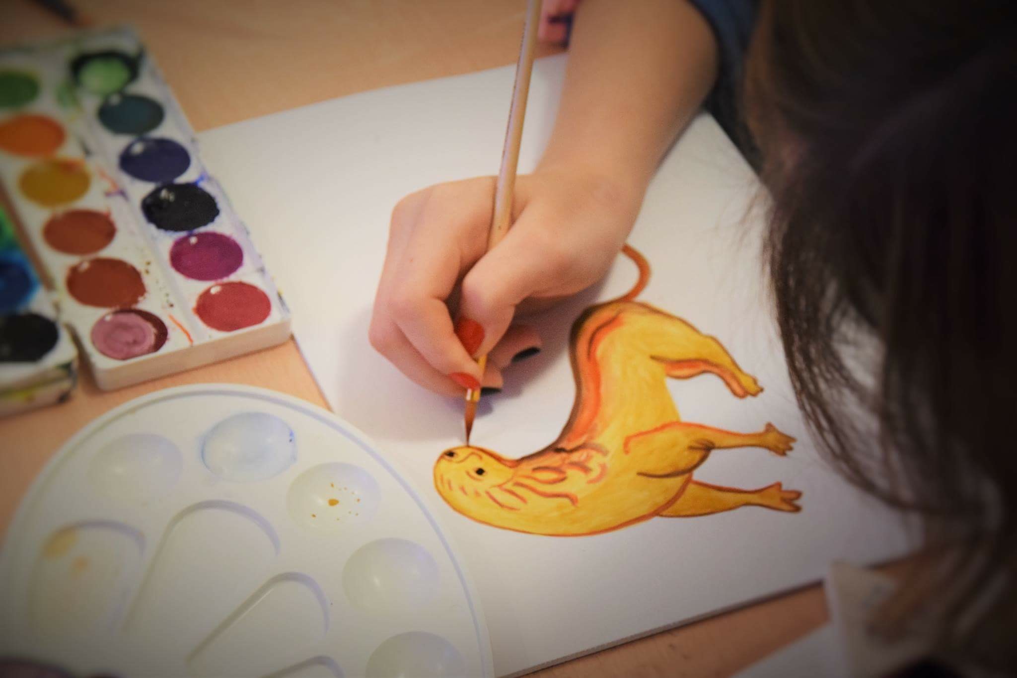 Первый семестр был посвящен работе акварелью. Самые первые занятия – рисованию отдельных элементов, взятых с икон или росписей. Например, какая-нибудь сабелька воина, или шапка князя, кустарник и домик с иконы XV века. Далее для цельных композиций идеально подошли самые простые древнерусские рисунки буквиц. Это копии буквиц преподобного Андрея Рублева: «Лев» и буквица «Цапля, ухватившая змею». Дело в том, что буквицы просты для копирования и в то же время интересны детям по смыслу и образу, ведь изображаются там, как правило, птицы и звери.