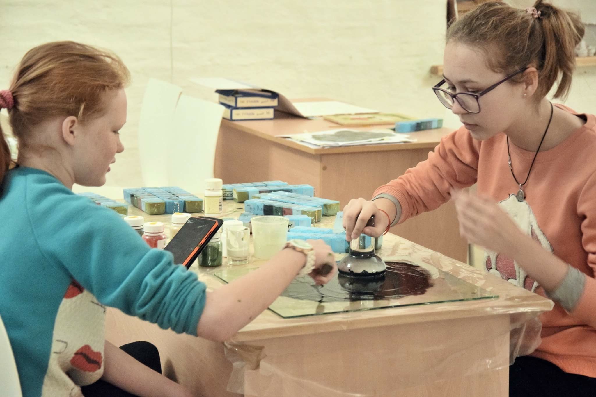 На занятиях первого года иконописного кружка дети научились растирать на стекле краски из минералов, готовить клеи и освоили сложную технику темперной живописи.