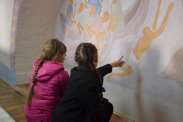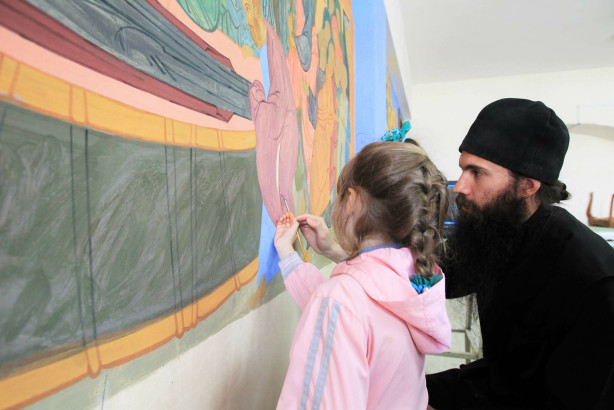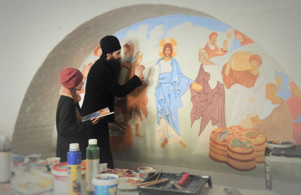 Но и сейчас ребята приходят в монастырь иногда не в воскресный день, когда проходят наши занятия, а в будни, просто так, небольшими группами, навестить меня после школьных уроков. Я в это время делаю росписи в монастырской трапезной, и дети имеют возможность посмотреть, как создается настенная композиция, помогают, держат палитру, наблюдают за процессом, задают вопросы. Я рассказываю им, как надо смешивать краску и проводить линии, а потом прекращаю работу, и мы идем пить чай. А иногда мы идем в храм, чтобы поставить свечи, и только потом – к столу. Время от времени я доверяю ребятам нарисовать какие-нибудь простые узоры на росписях не потому, что не успеваю, а чтобы у них остались приятные воспоминания, что они поучаствовали в важном деле. Это всё и есть, наверное, самые задушевные моменты в нашем изучении иконописи.