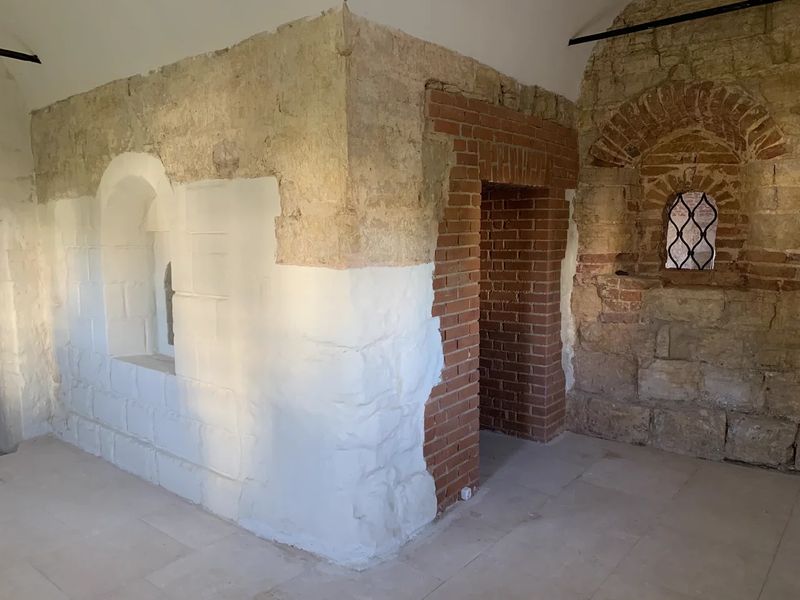 Стены хорошо сохранились. Реставраторами лишь заложены небольшие повреждения в кладке, причем они специально делали так, чтобы не имитировать старину – видно, что это современный кирпич.