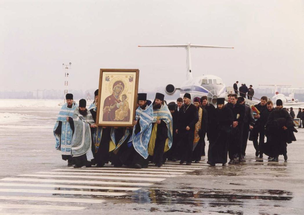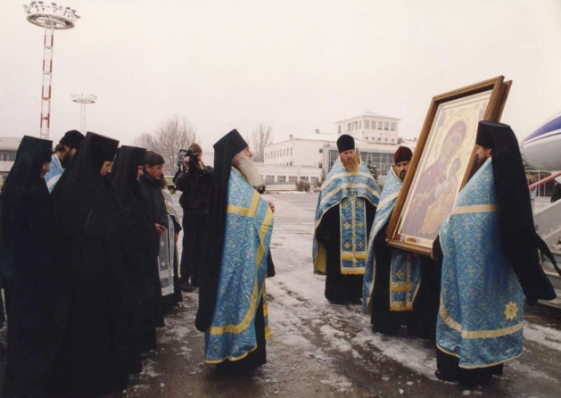 Помню, когда Евгений позвонил и сообщил эту новость, то мне в первые минуты разговора в такое чудо даже не верилось! От волнения я не находила нужные слова, и лишь в душе отчетливо звучала мысль, что Царица Небесная, как и прежде, являет Свою милость, – но теперь к нам, таким немощным современным насельницам обители. Всё то время ожидания, когда икона писалась на Афоне, мы с сестрами молились, чтобы Пресвятая Богородица пришла к нам в лице Своего дивного образа. Были трудные 90-е годы для страны, в том числе и для нашего монастыря – годы начинающегося возрождения монашеской жизни, возведения из руин храма и корпусов, налаживания хозяйственно-бытовых условий. И надежда наша на заступничество Царицы Небесной не посрамилась: в 1999 году икону доставили самолетом в Москву. Прямых международных рейсов между Афинами и Ростовом тогда не было, поэтому после длительных переговоров, на которые ушло много месяцев, икону доставили в Московский Донской мужской монастырь. Но и на этом наши переживания не закончились: еще почти год пришлось ждать разрешения разных ведомств и учреждений, чтобы Афонская святыня наконец-то прибыла в наш город. Произошло это событие 20 января в юбилейный год 2000-летия Рождества Христова. Икону сопровождала делегация монашествующих Донской обители во главе с ее наместником архимандритом Агафодором (Маркевичем), пожелавшим лично доставить к нам долгожданный образ. Очень волнующим был момент встречи иконы Царицы Небесной в аэропорту, куда я приехала с некоторыми сестрами и духовником нашей обители приснопамятным архимандритом Модестом (Потаповым), наместником Донского мужского Старочеркасского монастыря.