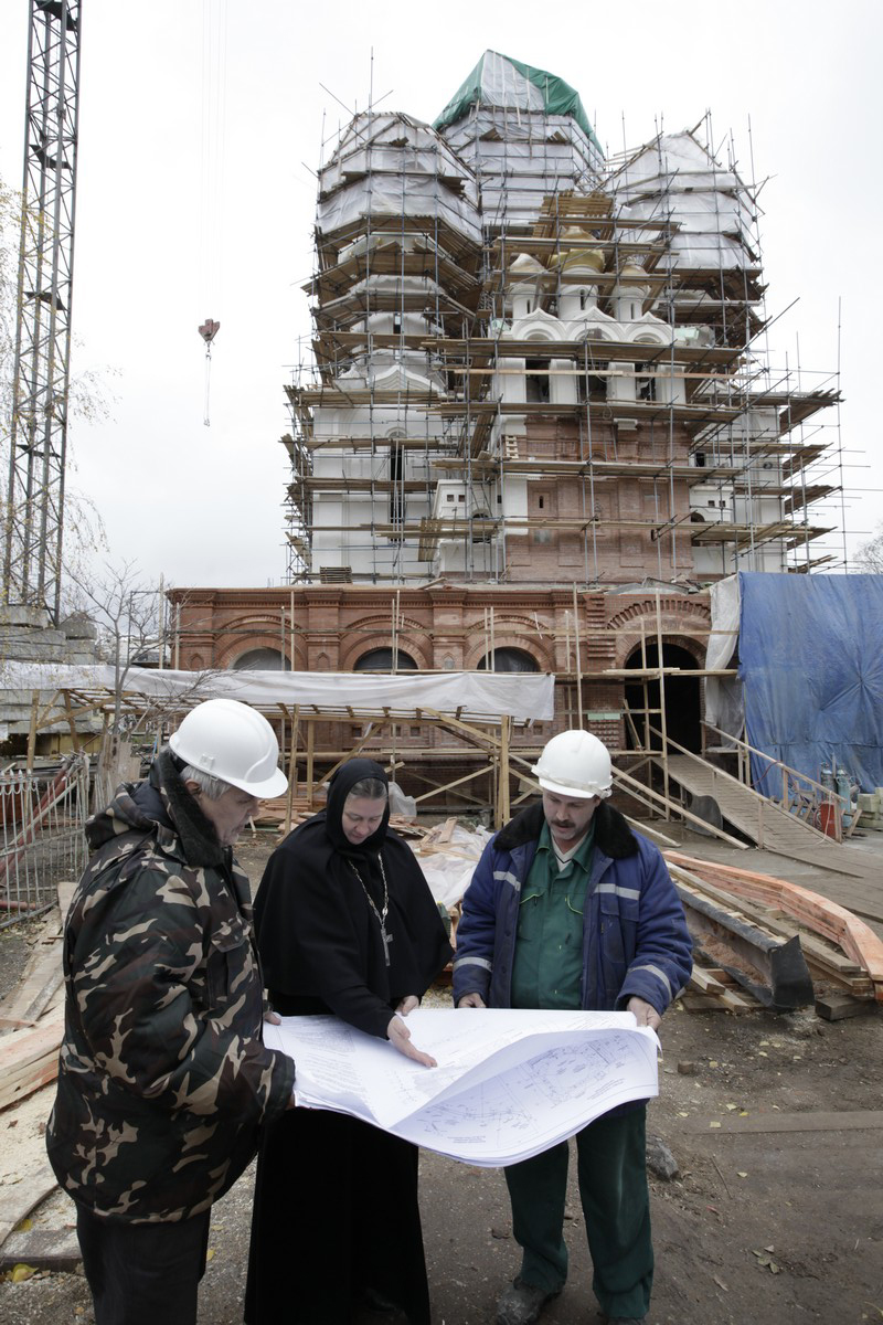 Немало сложных вопросов возникло по строительству собора после того, как находившееся на его месте здание общеобразовательной школы было передано нам в 2002 году и разобрано. Во-первых, хотелось построить собор не в неоготическом стиле, а в древнерусском, чтобы он органично вписался в облик древнего монастыря. Во-вторых, действительно, размеры прежнего соборного храма, авторство которого приписывают выдающемуся архитектору Матвею Федоровичу Казакову, нас не устраивали. Монастырь находится в непосредственном подчинении у Святейшего Патриарха, и Его Святейшество вместе с архиереями, сонмом духовенства часто на праздники совершает здесь богослужения. Богомольцев в обитель приходит много. Бывает много гостей, представителей власти, официальных лиц, с которыми у нас добрые отношения. И если бы мы новый собор сделали точной копией прежнего, то как бы он вместил всех людей, желающих разделить с сестрами обители радость праздника? В то же время согласно Московскому законодательству снесенные большевиками памятники следует восстанавливать в том виде, в каком они были до сноса. Два ключевых события вспоминаются из тех напряженных дней. Диалог со Святейшим Патриархом Алексием II и заседание совместного Методического совета Министерства культуры и Главного управления охраны памятников г. Москвы, на котором решилась судьба нашего собора, то есть нам разрешили его строить в древнерусском стиле.