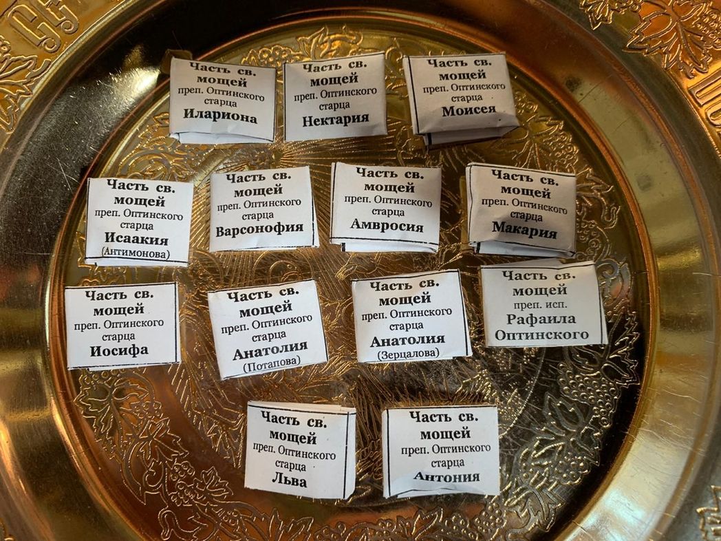Но вернемся к нашим дням. В 2019 году по благословению митрополита Феофана Казанского и Татарстанского при содействии благотворителей нами была заказана большая икона «Собор Оптинских старцев», с отработанной иконографией, которая пишется во Введенском ставропигиальном мужском монастыре Оптина пустынь. Поскольку монастырь ставропигиальный, то было подано прошение в Московскую Патриархию о выделении частичек мощей Оптинских старцев. В сентябре этого года на имя владыки Феофана пришло письмо за подписью председателя Синодального отдела по монастырям и монашеству архиепископа Каширского Феогноста, в котором сообщалось, что Святейший Патриарх Московский и всея Руси Кирилл дал свое благословение. Мы с радостью отправились в Оптину пустынь, где встретились с ее наместником, епископом Леонидом, и в дар от Раифского монастыря передали моей дорогой альма матер икону преподобного Гавриила Седмиезерного с мощевиком. Богу было угодно, чтобы прибытие мощей в Раифу и написание иконы пришлись на Собор Оптинских старцев. Икону мы торжественно освятили, совершили молебен и определили для нее место в пятиглавом Троицком соборе, справа от входа.