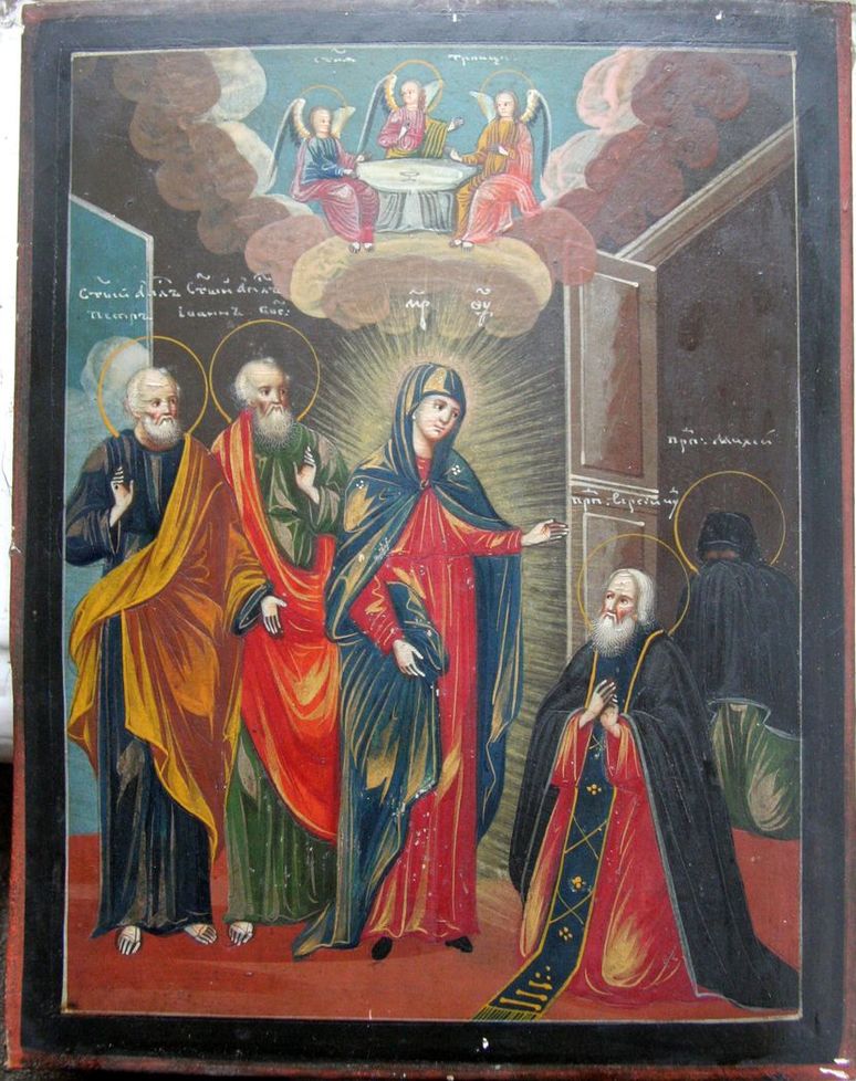 Мы знаем две его иконы, но наверняка их было больше: житийную икону преподобного Сергия (1591) и икону «Явление Божией Матери преподобному Сергию» (1588) – она была средником складня, который находился в иконостасе Троицкого собора. Это не самая древняя икона вот этой иконографии, мы знаем и более ранние изображения чудесного события – в миниатюрах, иконах. Но икона, написанная Евстафием (Головкиным), почиталась как чудотворная, ее возили в войска, когда предстояли значимые битвы, в том числе и во время Первой мировой войны. Она какое-то время была в ставке – как благословение преподобного Сергия.