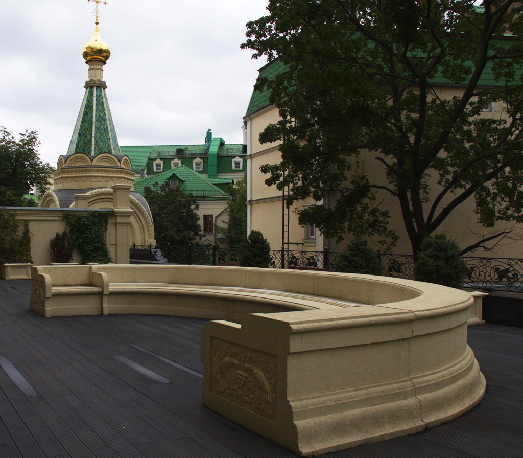 Снаружи стены нашей любимой семинарии украшают объемные орнаменты византийской традиции и удивительной красоты майоликовые панно: одно — исполненное на сюжет «Святой Пророк Божий Иоанн Предтеча — Ангел пустыни», другое — посвящено священномученику Илариону (Троицкому), покровителю монастыря и семинарии. И то, и другое рассказывают о восхождении к Богу.