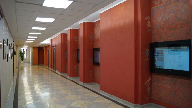 В коридоре на стенах — сенсорные панели. С их помощью каждый семинарист может найти необходимую ему информацию: расписание занятий и богослужений, сведения о преподавателях и выпускниках, историю монастыря и семинарии. А рамами для этих экранов служат орнаменты по мотивам византийских фресок.