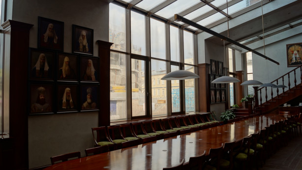 Вернемся на первый этаж и продолжим путешествие. Нас встречают великие учителя и подвижники Церкви — апостол Петр, святитель Иоанн Златоуст, преподобный Серафим Саровский и святитель Тихон, Патриарх Российский. Парсуны с их изображениями находятся в парадном фойе семинарии. К слову, мощи первого после синодального периода патриарха обретались при участии нашего ректора, епископа Тихона (Шевкунова). И наречен ректор именем Тихон как раз в честь святителя.
