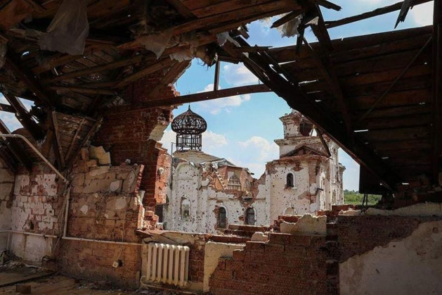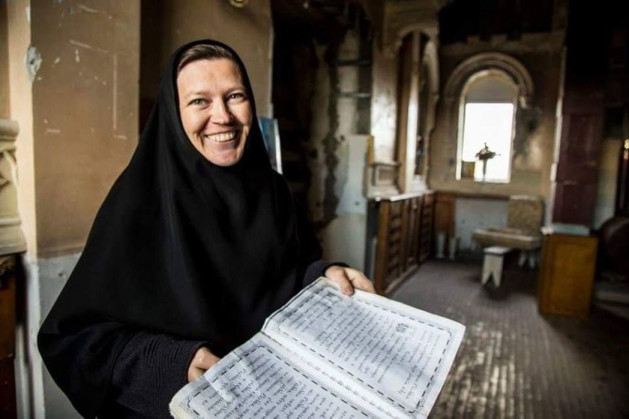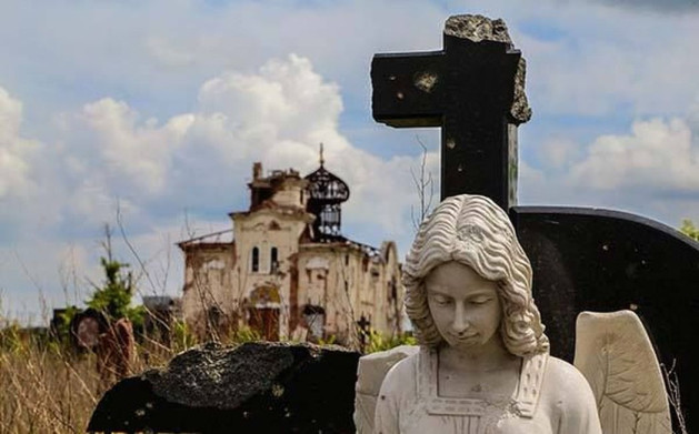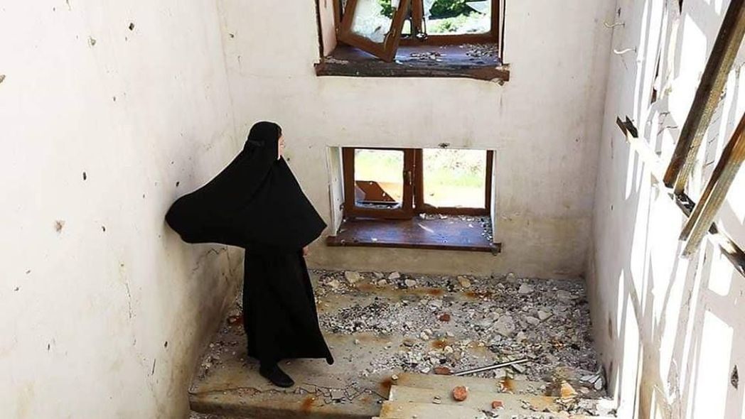 Вот игумения Михаила читает акафист под открытым небом в дождь. Крыши у церкви нет... Вот кадры, на которых видна разбитая могильная плита с ликом Богородицы. Образ Матери Божией сильно пострадал, но образ Младенца остался нетронутым.