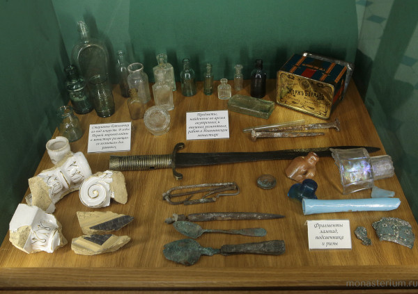 ...В той нише, что «подсказала» матушке-настоятельнице и сестрам обители идею создания постоянной музейной композиции, размещено много разных экспонатов. Все их не перечислить, это займет много места. Но хочется обратить внимание, например, на кружечку с портретом дорогого Батюшки; на пасхальное яичко, подаренное пастырем одной девочке, пришедшей, как она записала, с маменькой поздравлять его на Пасху. Есть здесь и старинный подсвечник, фрагменты старинных лампад, фрагменты фарфорового киота. В самом низу – медицинские склянки с надписями на латыни (память о том, что тут был лазарет) и штык от винтовки, найденный в стене. Чуть выше, на стеклянной полке – шкатулка, принадлежавшая игумении Ангелине, и ряд фотографий. На одной из них (портрет матушки Ангелины во весь рост) следует подробно остановиться, потому что данный снимок, где четко виден задний план – лепнина, арка, – помог сестрам определить, в каком монастырском помещении Матушка находится. Место это примечательное: большая зала на втором этаже в покоях Кронштадтского пастыря. В ней устраивались трапезы для гостей, в ней Батюшка принимал людей. За дверью находилась винтовая лестница, которая вела в храм преподобного Иоанна Рыльского и дальше – в усыпальницу. Когда монастырь строился, отец Иоанн был уже известным пастырем и не мог свободно передвигаться – народ его ждал повсюду. Батюшку осаждали, напор был сильный, никакие уговоры, просьбы на людей, жаждущих его видеть, не действовали. Поэтому он из храма через алтарную часть поднимался по винтовой лестнице к себе в покои, чтобы иметь хотя бы какие-то минуты отдыха. А с 1905 года отец Иоанн – и до того прихварывавший –  почувствовал себя совсем плохо и начал задумываться о месте своего погребения. «Не вызывает сомнений, что Батюшка прозорливо предвидел: все погребения священнослужителей на территории Андреевского собора в Кронштадте, где он служил, будут уничтожены. И, конечно, он знал волю Божию о себе, что должен быть погребенным в Иоанновском монастыре, – убежденно произнесла монахиня Фаина. – Он попросил митрополита Антония в виде исключения разрешить похоронить его в Петербурге, в основанной им обители. Разрешение было получено. И монахиня Иоанна (Лежоева), казначея монастыря, все свое наследство употребила на устройство храма-усыпальницы в крипте Иоанновского монастыря».