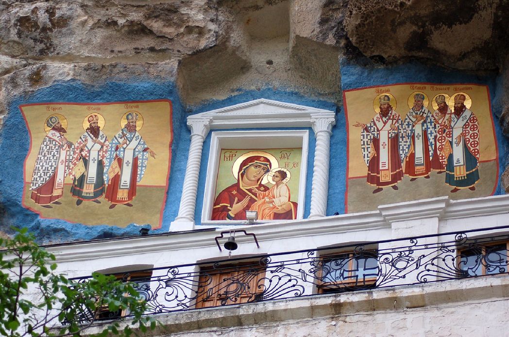 В Свято-Успенском пещерном монастыре за минувшие века тоже всё это было. Но чудесное явление иконы Божией Матери помогло христианам Тавриды, возносившим молитвы Спасителю в самом центре ислама, укорениться в своей вере. Икона стала главной святыней обители – причем почиталась она и мусульманами (простыми, а также «высокопоставленными» – например, ханом, ставившим накануне военного похода перед святым образом пудовую восковую свечу). У иконы несколько названий: Бахчисарайская, Панагия, Крымская икона Богоматери и Мариупольская. До нас дошли разные предания относительно появления здесь чудотворного образа. Согласно одному из них, в каменных горах некий змий пожирал людей и скот. Греки и генуэзцы (это итальянцы, в средние века активно заселявшие Крымский полуостров вдоль Черноморского побережья) стали просить Пресвятую Богородицу освободить их от змия. И как-то люди увидели наверху свечу горящую, но гора была настолько крутая, что добраться туда оказалось невозможно. Тогда они вытесали ступени из камня и когда поднялись наверх, увидели: свеча горит перед образом Божией Матери. Кроме того, увидели мертвого змия: «его же изсекши в части, сожгоша огнем, и от того времени жителие тамошние часто начаша ходити тамо и молитися Пресвятой Богородице» (из народного предания, сохраненного для нас русскими писателями ХVII века).