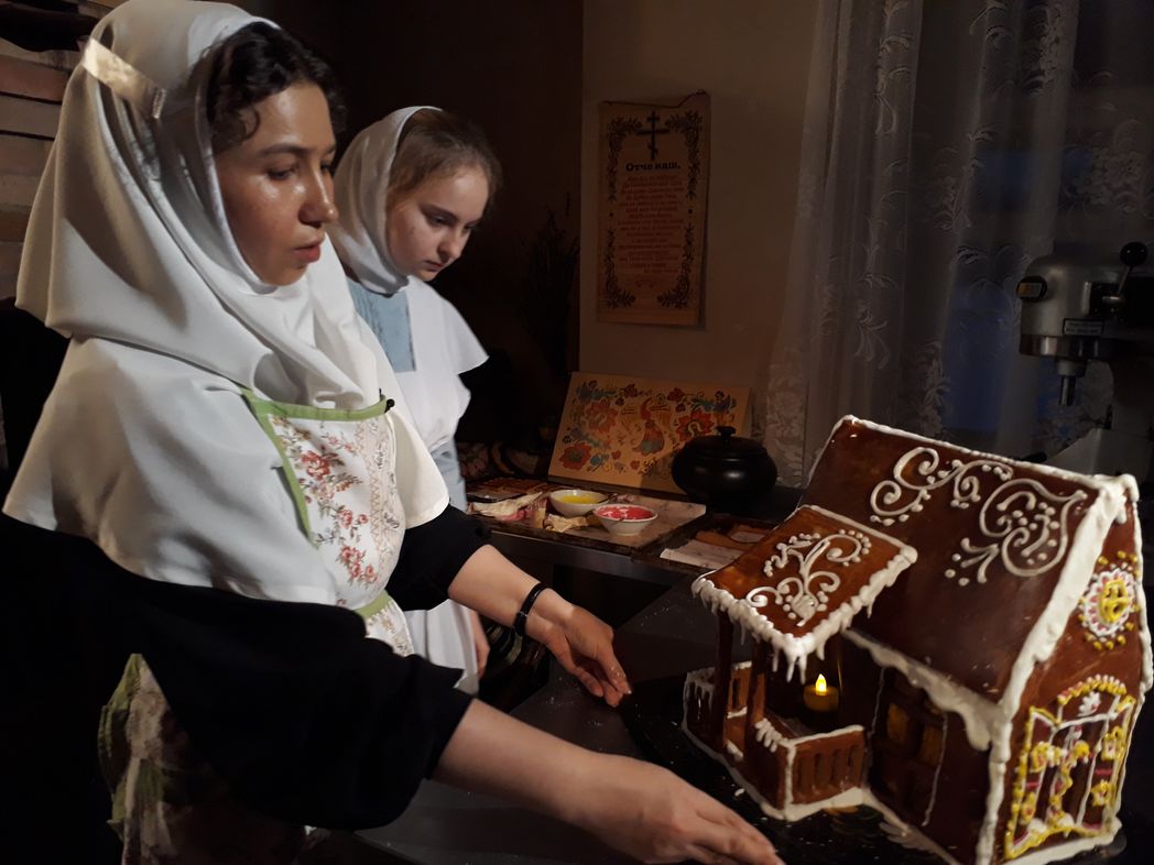 Практически все девочки занимаются рукоделием. Их работы представлены на импровизированной выставке в паломнической трапезной. Помогают сестрам по хозяйству, стараются на кухне. Монастырь изготавливает много видов выпечки и кондитерских изделий. Это очень вкусные продукты, настоящего – монастырского – качества. Некоторые из девочек уже определились в выборе профессии и в будущем видят себя кондитерами. В преддверии Рождества Христова, как и всякого большого праздника, здесь все стали большими затейницами – придумывают нечто особенное. Уже второй год подряд все сообща создают большой пряничный домик. Дело это непростое. Как настоящие архитекторы, мастерят макеты-трафареты будущего строения, по ним вырезают детали из теста, щедро наполненного пряностями, – в этом году дом получится с террасой и балкончиками. Потом части дома отправляют в настоящую русскую печь. Все выпеченные детали надо собрать, соединить, по-праздничному украсить. Окошки делают из кусочков карамели, и напоминают они настоящую слюду.